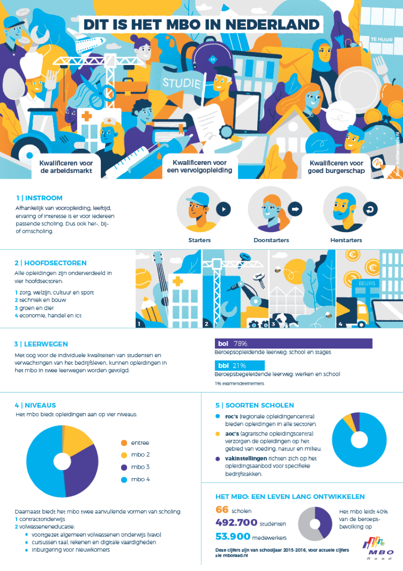 Mbo-opleidingen variëren enorm in grootte en indeling. De grote opleidingen zijn vaak over meerdere locaties en gebouwen verspreid, terwijl de kleinere mbo-scholen de studies op één locatie verzorgen.Het middelbaar beroepsonderwijs heeft een breed aanbod van opleidingen op verschillende niveaus. Afhankelijk van vooropleiding, leeftijd, ervaring of interesse is er voor elke student een passende opleiding. Het mbo is verplicht om alle studenten (ook als je een beperking hebt) aan te nemen die zich voor 1 april hebben ingeschreven en voldoen aan de eisen.